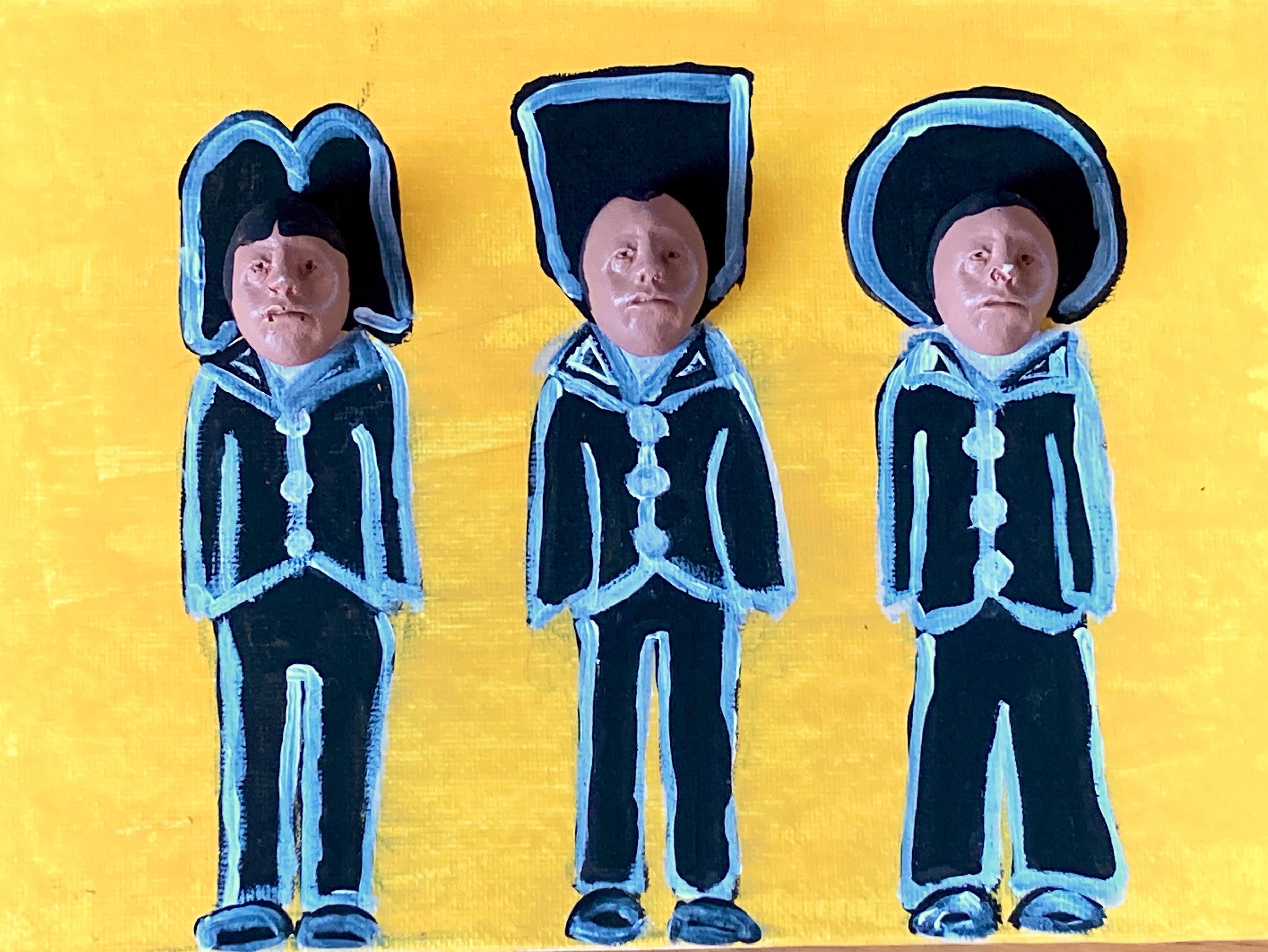 鮮やかな黄色の背景に並ぶ三人の人物。均一な制服とポーズは「同調」を表しながらも、それぞれの顔には不思議な違和感が潜んでいます。まるで世界に用意された舞台衣装を着せられた役者たちのように、彼らはそこに立ち尽くしています。